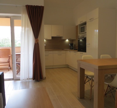 Apartman 4 raspolaže sa prekrasnim balkonom s kojeg se pruža pogled na bazen i zeleni okoliš. Apartman se nalazi s prednje strane na prvom katu dok je sa stražnje strane praktiči u prizemlju što vam osigurava laku prstupačnost ali i intimu.